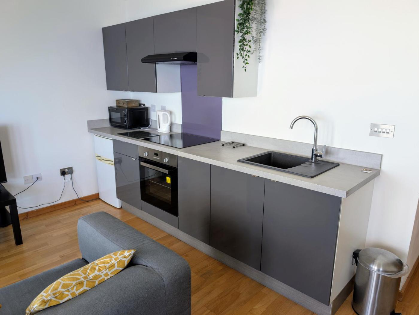 One-Bedroom Apartment. This apartment comprises a kitchen, a seating area, 1 separate bedroom and 1 bathroom with a bath and a shower. The well-fitted kitchen has a refrigerator, kitchenware and a microwave. This apartment features a tea and coffee maker, TV, sea views, as well as chocolate for guests. The unit offers 1 bed.